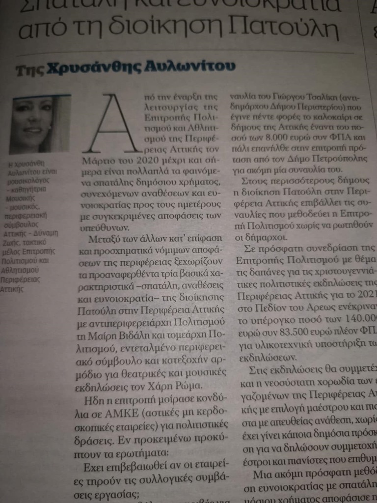 Σπατάλη, αναθέσεις και ευνοιοκρατία της διοίκησης Πατούλη από την επιτροπή Πολιτισμού Αθλητισμού της Περιφέρειας Αττικής.