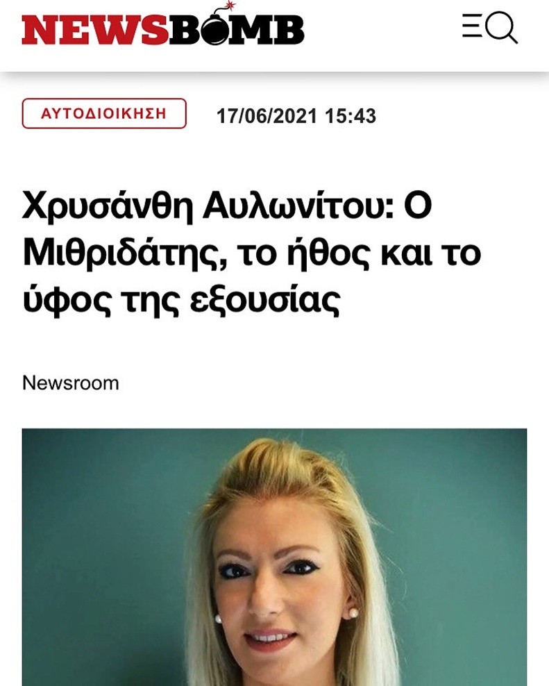 *Το άρθρο μου δημοσιεύθηκε στο Newsbomb.gr στις 17/6/21 https://www.newsbomb.gr/politikh/aytodioikhsh/story/1206809/xrysanthi-aylonitoy-o-mithridatis-to-ithos-kai-to-yfos-tis-exoysias